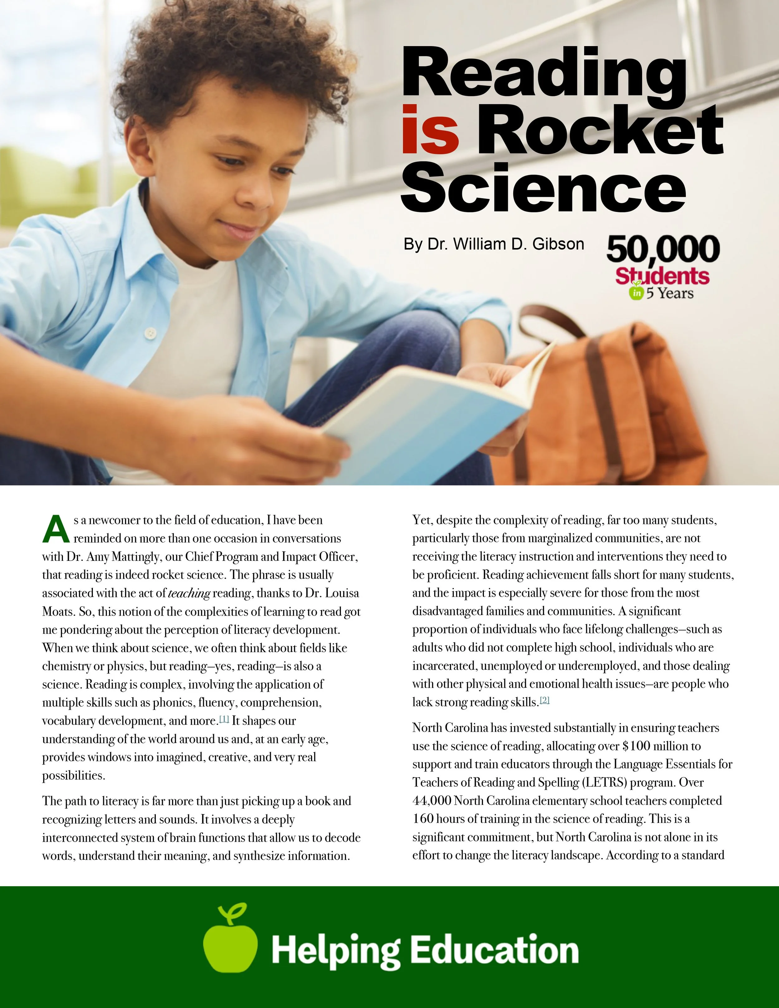 As a newcomer to the field of education, I have been reminded on more than one occasion in conversations with Dr. Amy Mattingly, our Chief Program and Impact Officer, that reading is indeed rocket science. The phrase is usually associated with the act of teaching reading, thanks to Dr. Louisa Moats. So, this notion of the complexities of learning to read got me pondering about the perception of literacy development. When we think about science, we often think about fields like chemistry or physics, but reading—yes, reading—is also a science. Reading is complex, involving the application of multiple skills such as phonics, fluency, comprehension, vocabulary development, and more.[1] It shapes our understanding of the world around us and, at an early age, provides windows into imagined, creative, and very real possibilities.